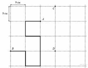 Лист бумаги расчерчен на квадраты со стороной 9 см. От точки А к точке В проведена ломаная по сторонам квадратов.