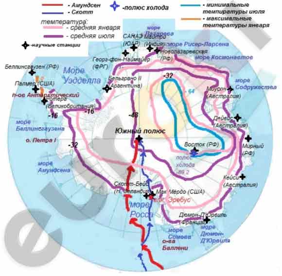 •  обозначьте маршруты движения экспедиций Р. Амундсена и Р. Скотта.