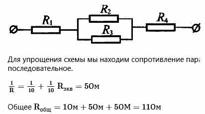Чему равно общее сопротивление участка цепи, изображенного на рисунке, если R1 = 1 Ом, R2 = 10 Ом, R3 = 10 Ом, R4 = 5 Ом?