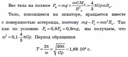 Вес тела на экваторе астероида на 10% меньше веса на полюсе. Чему равен период обращения астероида вокруг своей оси, если астероид представляет собой шар с плотностью вещества р = 5*10^3 кг/м3?