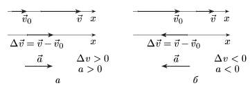При равноускоренном движении вектор ускорения а направлен так же, как и вектор скорости (рис. 1.42 а), а при равнозамедленном движении — направлен противоположно скорости (рис. 1.42 6).