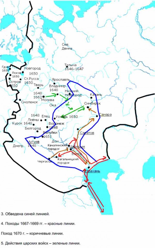 4.  Стрелками разного цвета покажите походы С. Разина в 1667—1669 гг. и в 1670 г.