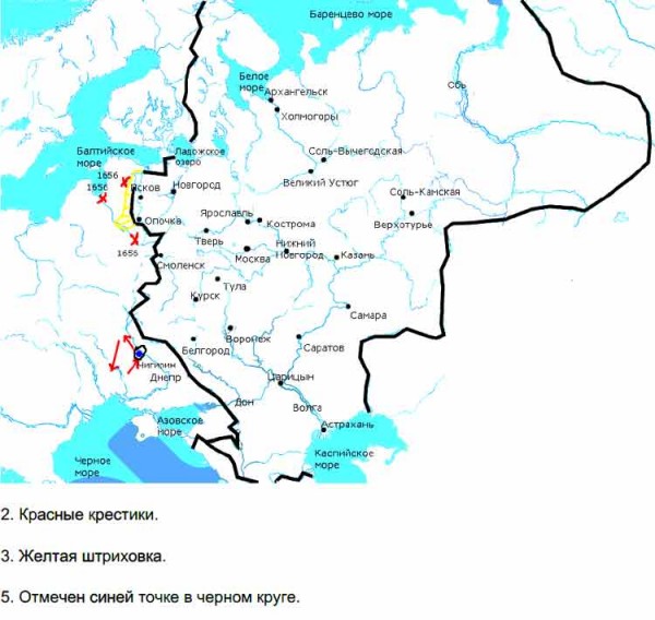 1.  Обведите границы Российского государства к середине XVII в. Подпишите Москву — столицу государства, города, обозначенные пунсонами на карте, а также моря, озера, крупные реки.
