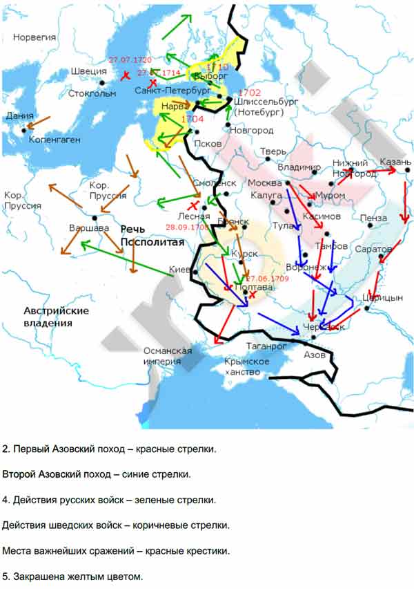 4.   Стрелками разного цвета покажите действия русских и шведских войск в Северной войне; подпишите места и годы важнейших сражений.