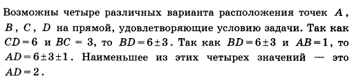 На прямой расположены точки А, В, С и D, при этом АВ = 1, ВС = 3, CD = 6 . Какое наименьшее значение может принимать длина отрезка AD ?