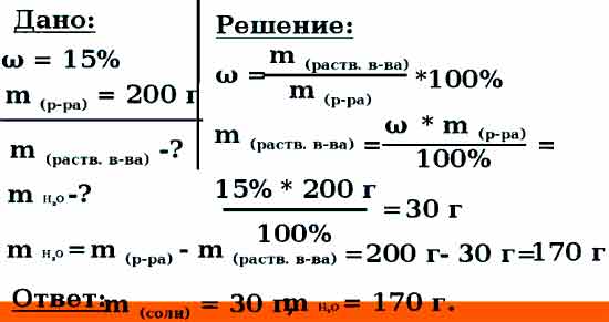 Определите, сколько потребуется соли и воды, чтобы приготовить 200 г раствора, содержащего 15 % соли.