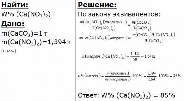 При обработке карбоната кальция массой 1 т разбавленной азотной кислотой был получен нитрат кальция массой 1,394 т. Найдите массовую долю выхода продукта реакции от теоретически возможного