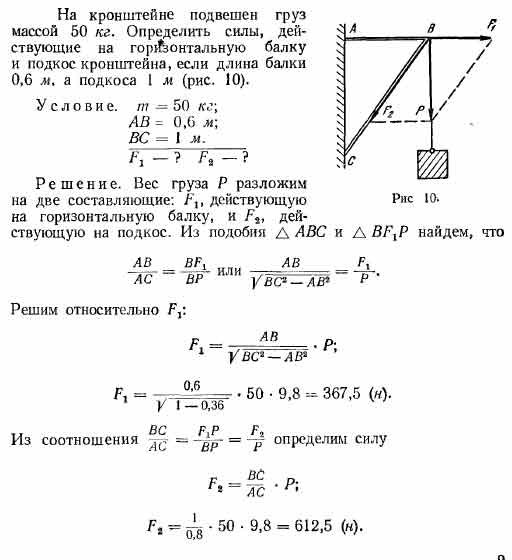 На кронштейне подвешен груз массой 50 кг. Определить силы, действующие на горизонтальную балку и подкос кронштейна, если длина балки 0,6 м, а подкоса 1 м