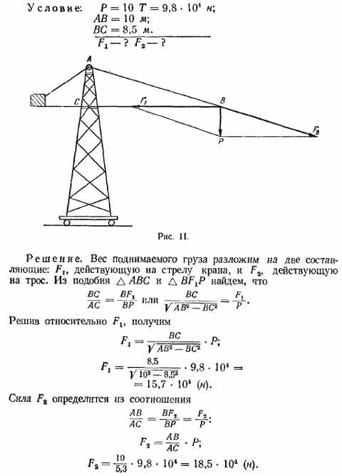 Определить силы, действующие на стрелу ВС и трос АВ башенного крана при подъеме груза весом 10 Г, если АВ = 10 м, а ВС = 8,5 м