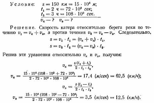 Пассажирский катер проходит расстояние 150 км между двумя пристанями по течению за 2 часа, а против течения — за 3 часа. Определить скорость катера в стоячей воде и скорость течения воды в реке.