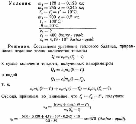 В латунный калориметр массой 128 г, содержащий 245 г воды при температуре 10°С, опущено тело массой 200 г, нагретое до температуры 100°С. В калориметре устанавливается температура 20°С. Определить удельную теплоемкость испытуемого тела