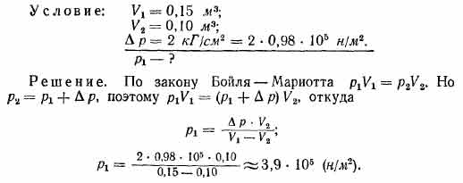 Газ изотермически сжат от первоначального объема 0,15 м3 до объема 0,10 м3. Давление его при этом повысилось на 2 кг/см2. Каково первоначальное давление газа?