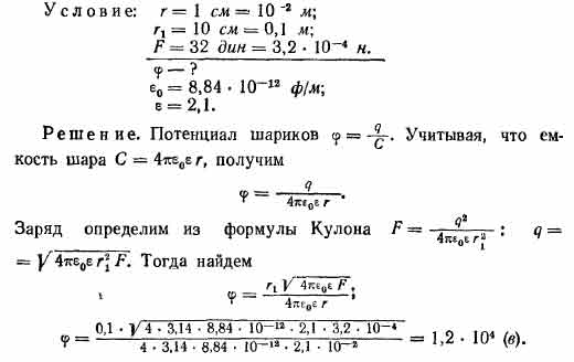 Два одинаковых шарика радиусом 1 см каждый находятся в керосине на расстоянии 10 см друг от друга и взаимодействуют с силой 32 дин. Определить потенциал шариков.