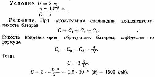 Три одинаковых конденсатора соединены параллельно в батарею. Определить емкость батареи, если известно, что при подключении ее к полюсам аккумулятора (U = 2 в) заряд на обкладках каждого конденсатора 10~9 к.