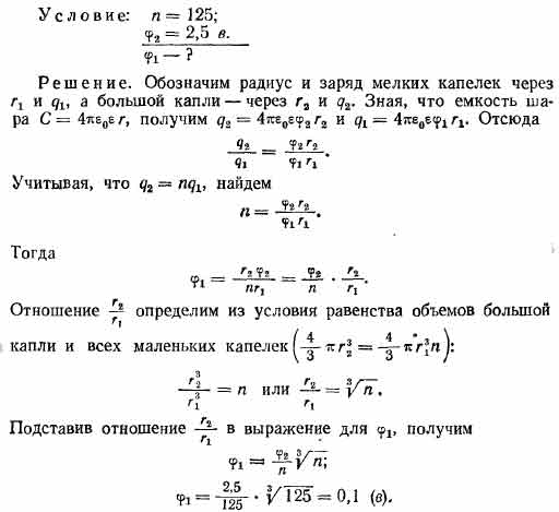 Большая шарообразная капля воды получена в результате слияния 125 одинаковых мелких шарообразных капелек. До какого потенциала были заряжены мелкие капельки, если потенциал большой капли оказался равным 2,5 е?