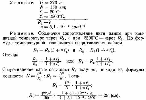 На цоколе вольфрамовой лампы накаливания написано «220 в, 150 вт». Определить сопротивление нити лампы при комнатной температуре (20°С), если температура накала нити, лампы 2500С.