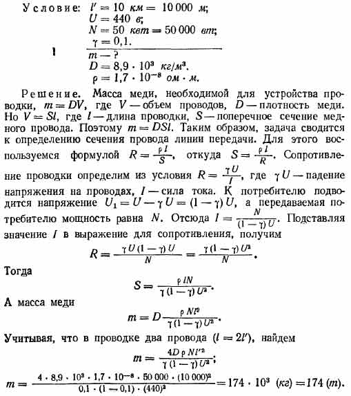 Сколько меди нужно для устройства линии передачи длиной 10 км, если напряжение на электростанции 440 в, а потребителю необходимо передать мощность 50 квт при допустимой потере напряжения в проводке 10%?
