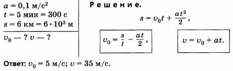 Определите начальную v0 и конечную v скорости мотоцикла, если он, двигаясь с постоянным ускорением а = 0,1 м/с2, за время t = 5 мин преодолел расстояние s = 6 км