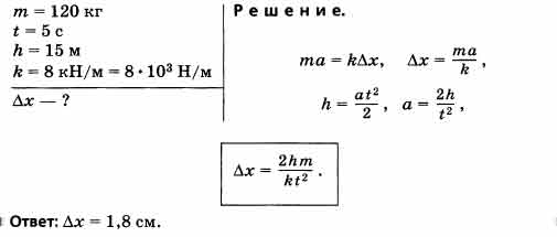 Тело массой m = 120 кг равноускоренно поднимают на тросе вверх в течение t = 5 с на высоту h = 15 м. Определите удлинение троса, если его коэффициент упругости k = 8 кН/м.