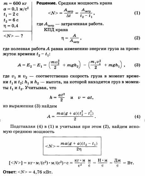Подъемный кран поднимает груз массой m = 600 кг с ускорением а = 0,1 м/с2. Определите среднюю мощность крана за время от t1 = 2 с до t2 = 6 с, если коэффициент полезного действия крана n = 50%.
