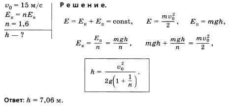 Тело брошено вертикально вверх со скоростью v0 = 15 м/с. Определите, на какой высоте h потенциальная энергия тела в п = 1,6 раза больше кинетической. Сопротивление воздуха не учитывать