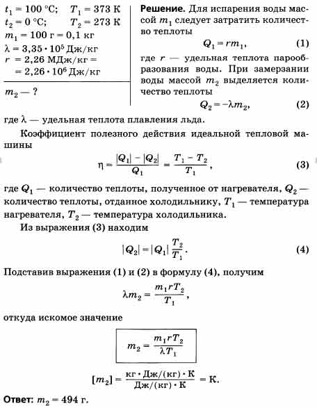 В идеальной тепловой машине Карно, работающей по обратному циклу (холодильной машине), в качестве холодильника используется вода при 0 °С, а в качестве нагревателя — вода при 100 °С. Сколько воды следует заморозить в холодильнике, чтобы превратить в пар 100 г воды в нагревателе? Удельная теплота плавления льда X = 3,35 • 10^5 Дж/кг, удельная теплота парообразования воды r = 2,26 МДж/кг.