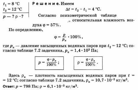 Влажный термометр психрометра показывает температуру t1 = 8 °С, а сухой — t2 = 12 °С. Определите парциальное давление р водяного пара в помещении и абсолютную влажность р