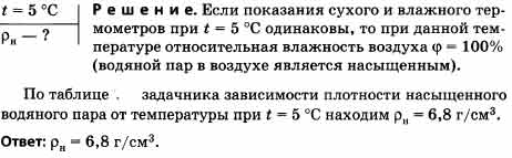 Показания сухого и влажного термометров психрометра при температуре t = 5 °С одинаковы. Определите плотность насыщенных водяных паров р в воздухе