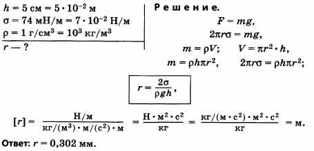 Определите радиус капиллярной трубки, если при полном смачивании вода в капилляре поднимается на высоту h = 5 см. Поверхностное натяжение воды а = 74 мН/м, а ее плотность р = 1 г/см3