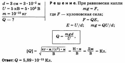 В пространстве между двумя горизонтально расположенными пластинами (расстояние между ними d = 3 см), заряженными до разности потенциалов U = 5 кВ, взвешена пылинка, масса которой m = 10~10кг. Определите заряд Q пылинки