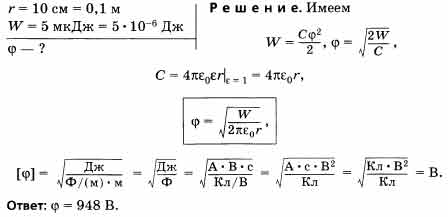 Определите потенциал ф заряженного проводящего шара радиусом r = 10 см, если он обладает энергией W = 5 мкДж