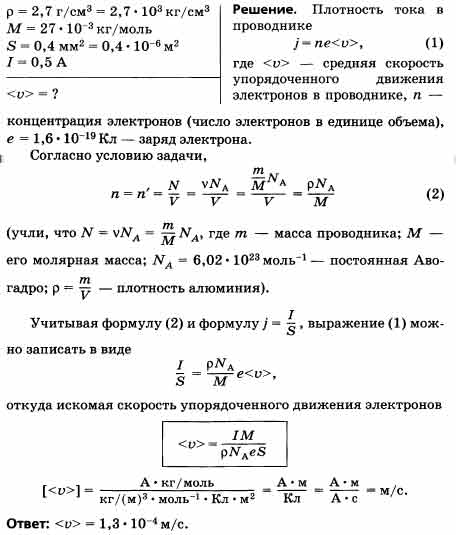 По проводнику, изготовленному из аллюминия (р = 2,7 г/см3; m = 27 • 10~3 кг/моль) сечением S = 0,4 мм2, течет ток I = 0,5 А. Определите среднюю скорость упорядоченного (направленного) движения электронов, считая, что число свободных электронов п в единице объема проводника равно числу атомов n' в единице объема проводника.