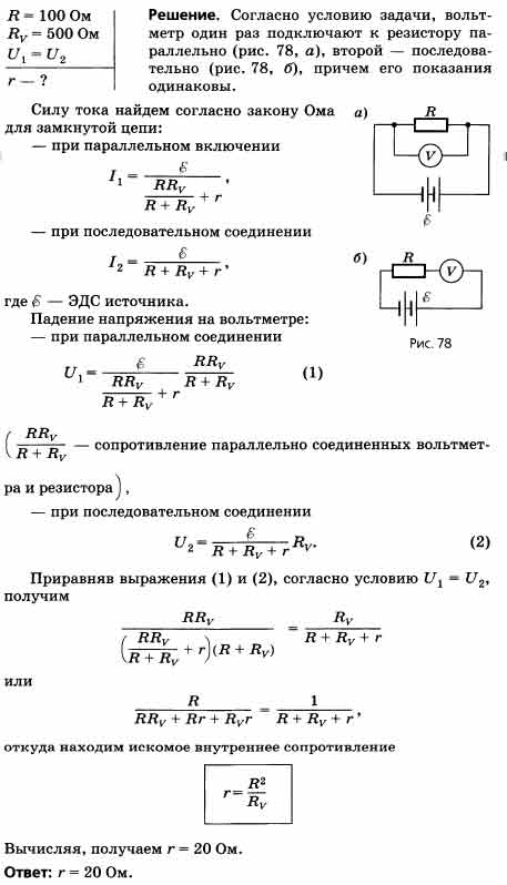 В цепь, состоящую из источника ЭДС и резистора сопротивлением R = 100 Ом, включают вольтметр сначала параллельно, а затем последовательно резистору, причем показания вольтметра одинаковы. Определите внутреннее сопротивление r источника ЭДС, если сопротивление вольтметра R  = 500 Ом.