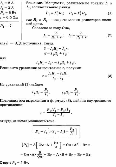 Определите мощность Р1 тока во внешней цепи при силе тока I1 = 2 А, если при силе тока I2 = 3 А мощность Р2 = 6 Вт, а внутреннее сопротивление ЭДС равно 0,5 Ом.