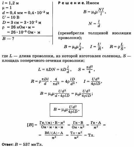 Соленоид без сердечника длиной I = 1,2 m изготовлен из вплотную прилегающей алюминиевой проволоки диаметром d = 0,4 мм. Определите индукцию В магнитного поля внутри соленоида, если диаметр витка D = 3 см и на концах проводника поддерживается разность потенциалов U = 10 В. Удельное сопротивление алюминия 26 нОм • м