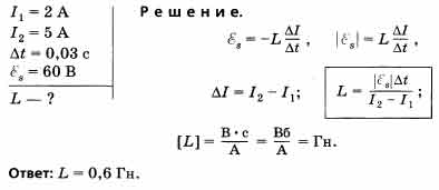 Определите индуктивность L соленоида, если при равномерном изменении силы тока от I1 = 2 А до I2 = 5 А за время t = 0,03 с в соленоиде возникает ЭДС самоиндукции e = 60 В