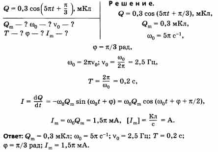 Электрический заряд на обкладках конденсатора в колебательном контуре изменяется по следующему закону: Q = 0,3 cos (2пt + п/3), мКл. Определите: амплитуду колебаний заряда Qm на обкладках конденсатора; циклическую частоту w0; частоту v0; период m и начальную фазу ф колебаний заряда; амплитуду Im силы тока в контуре