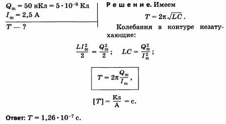 Определите период m незатухающих колебаний в контуре, если максимальный заряд Qm на обкладках конденсатора равен 50 нКл, а максимальная сила тока в контуре I = 2,5 А