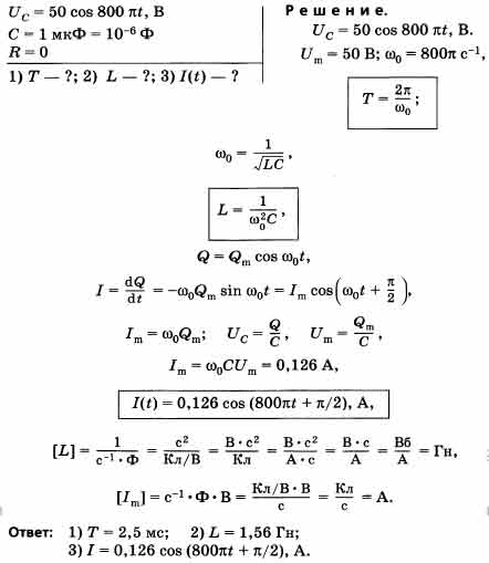 Уравнение изменения со временем напряжения на обкладках конденсатора в колебательном контуре U = 50 cos 800 nt, В. Электроемкость конденсатора С = 1 мкФ. Пренебрегая сопротивлением контура, определите: 1) период колебаний; 2) индуктивность контура; 3) закон изменения со временем силы тока в цепи