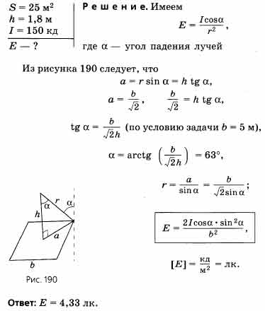В центре квадратной комнаты площадью S = 25 м2 на высоте h = 1,8 m висит светильник силой света I = 150 кд. Считая светильник точечным источником света, определите освещенность в одном из углов комнаты