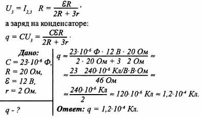 В схеме, изображенной на рисунке, емкость конденсатора С = 23 мкФ, резисторы имеют одинаковые сопротивления R = 20 Ом. Электродвижущая сила батареи e= 12 В, ее внутреннее сопротивление r = 2 Ом. Определите заряд на конденсаторе.