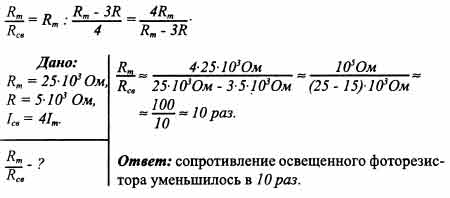 Фоторезистор, который в темноте имеет сопротивление R  = 25 кОм, включили последовательно с резистором сопротивлением R = 5 кОм. Когда фоторезистор осветили, сила тока в цепи (при том же напряжении) увеличилась в 4 раза. Во сколько раз уменьшилось сопротивление фоторезистора?