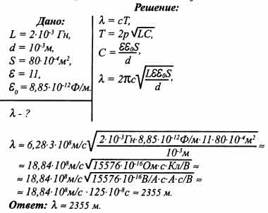 На какую длину волны настроен колебательный контур, если он состоит из плоского конденсатора и катушки индуктивностью L = 2*10-3 Гн  Расстояние между пластинами конденсатора d=1 мм площадь пластин S = 80 см2, конденсатор заполнен диэлектриком с S = 11. Электрическая постоянная e = 8,85*10-12 Ф/м.