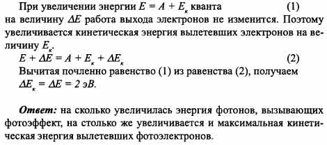 Энергия фотонов, вызывающих фотоэффект с поверхности цезия, возросла на 2 электронвольта. На сколько увеличилась при этом максимальная кинетическая энергия фотоэлектронов?