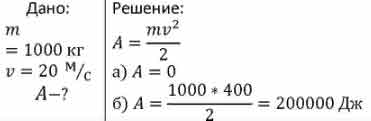 Чему равна кинетическая энергия стоящего на дороге автомобиля массой m = 1 т в системе отсчёта, связанной: а) с дорогой; б) с автобусом, едущим по дороге со скоростью 20 м/с?