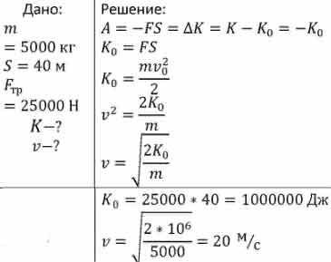 Определите начальную кинетическую энергию грузового автомобиля, который под действием постоянной силы трения проходит до полной остановки тормозной путь 40 м. Модуль силы трения равен 25 кН. Найдите начальную скорость автомобиля, если его масса равна m= 5 т.