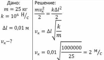На гладком горизонтальном полу с помощью бруска массой m =  25кг удерживают прижатую к стене лёгкую пружину жёсткостью к = 1 МН/м. При этом пружина была сжата из недеформированного состояния на l = 1 см. Найдите скорость, которую приобретёт брусок после его отпускания к тому моменту, когда на него перестанет действовать пружина.