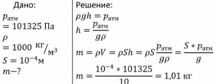 В 1648 г. Паскаль продемонстрировал, что можно создать очень большое давление, используя незначительное количество жидкости. Для этого в плотно закрытую бочку, целиком наполненную водой, он вставил через крышку вертикальную длинную узкую трубку. После того как Паскаль заполнил эту трубку водой, бочка треснула. Определите, какую массу воды он влил в трубку, если известно, что бочка выдерживает избыточное внутреннее давление 1 атм, а поперечное сечение трубки равно 1 см2.