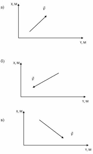 Изобразите на координатной плоскости векторы скоростей так, чтобы: а) проекции скорости на оси X и Y были положительны; б) проекции скорости на оси X и У были отрицательны; в) проекция скорости на ось X была положительна, а на ось Y — отрицательна.
