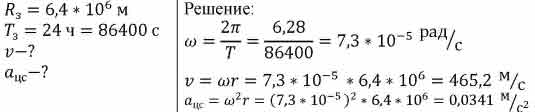 Определите модули скорости и центростремительного ускорения человека, стоящего на экваторе Земли, обусловленные её вращением вокруг своей оси. Радиус Земли считайте равным r = 6400 км.
